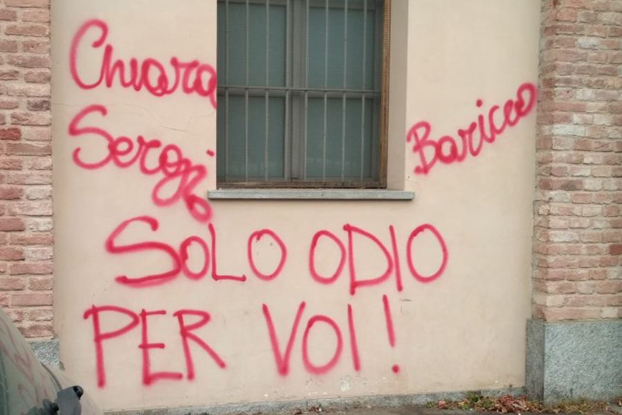 Proprio sui muri della Scuola e sul selciato davanti all’ingresso, nel giorno dell’inaugurazione della Holden Academy, prima università della scrittura in Europa. campeggiano le scritte fatte con lo spray bianco “Suk unito contro Appendino” e “Chiara, Chiampa, Baricco alleati contro i poveri”.