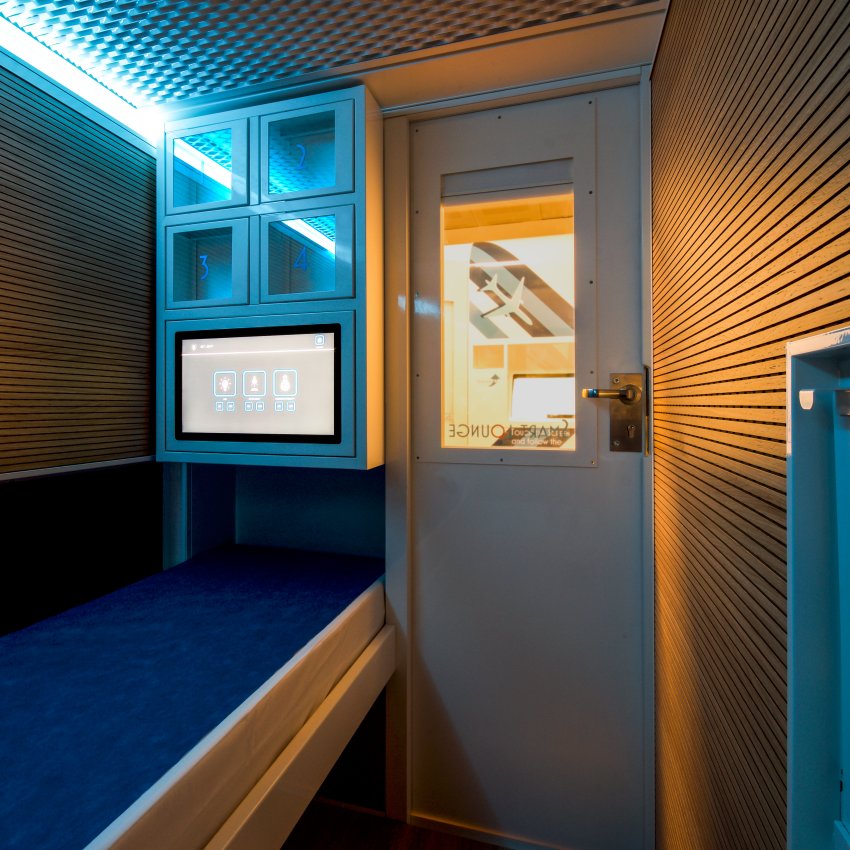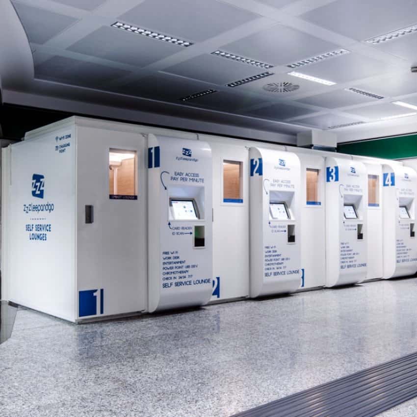 Sono stanzini, totalmente automatizzati, che garantiscono privacy, disposti come piccole camere con letto, e dotati di una scrivania per lavorare, ma anche deposito bagagli, free wi-fi, schermo con orario voli aggiornato in tempo reale, prese elettriche e usb.