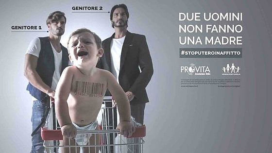 Nell’immagine di forte impatto visivo si vede un bambino all’interno di un carrello che piange disperatamente. Su di lui è applicato un codice a barre, come se si trattasse di una merce qualsiasi. Dietro il bimbo due ragazzi, segnati come “genitore 1” e “genitore 2” che secondo i responsabili della campagna, le associazioni Pro Vita e Generazione Famiglia, sono “due uomini che non fanno una madre”.