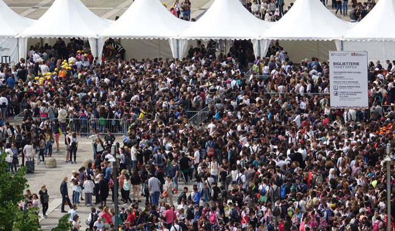 Lunghe le code all’ingresso, folla registrata anche davanti al padiglione giallo, dove si è tenuta la cerimonia di inaugurazione del Salone.