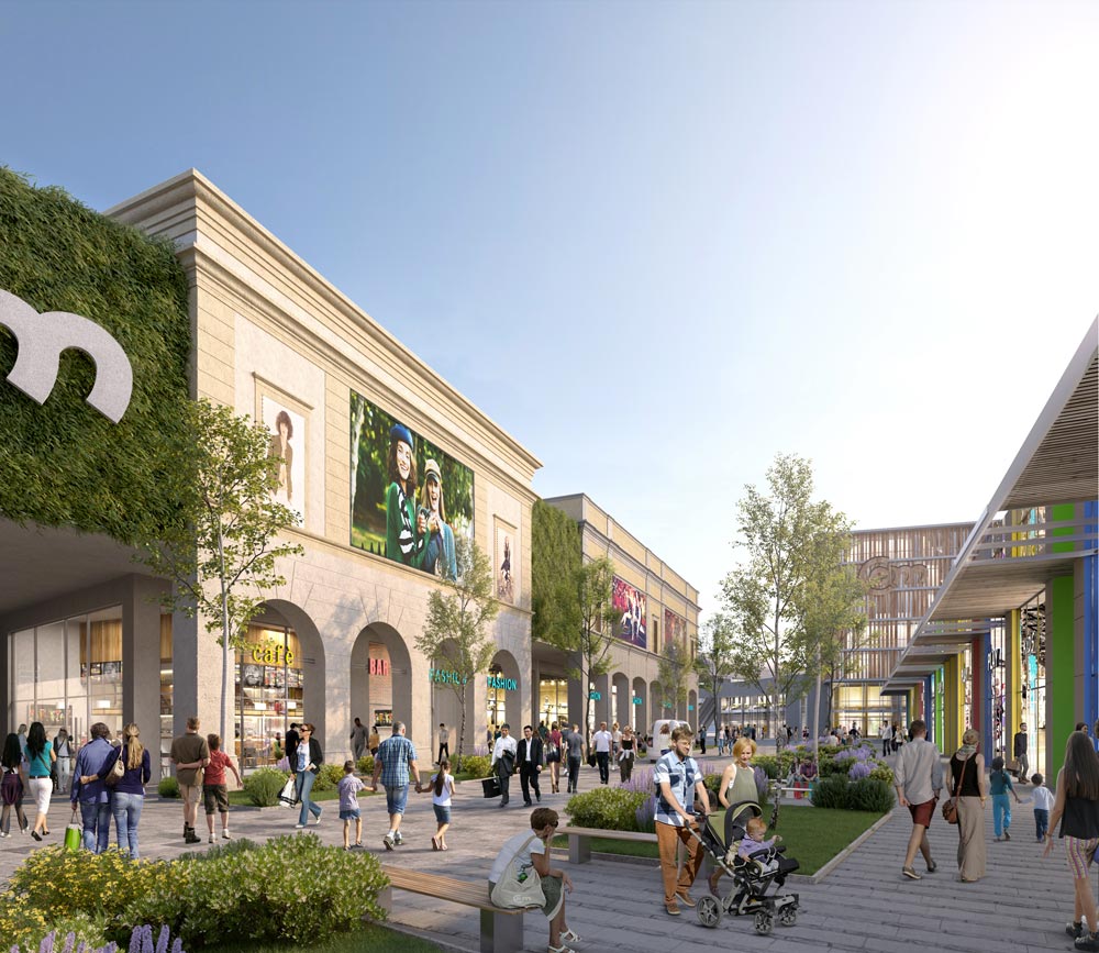 Il concept architettonico di Caselle Open Mall sarà composto da isolati indipendenti, affacciati su vie pedonali e disposti intorno a un nucleo centrale ispirato alle gallerie commerciali urbane delle città europee.