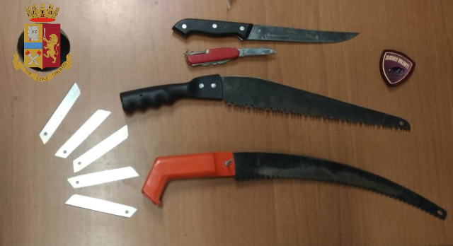 La perquisizione dello zaino consentiva anche il rinvenimento di 1 coltellino svizzero e di 5 lamette da taglierino della lunghezza di 11 cm ciascuna.