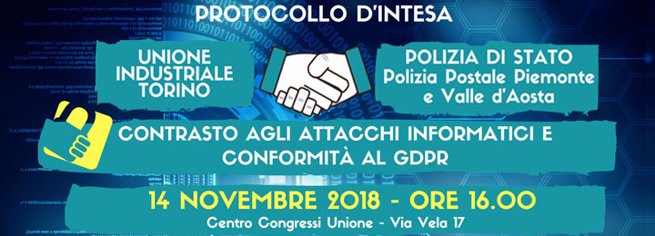 Di questi e altri temi si parlerà a Torino mercoledì 14 novembre alle ore 16.00, presso il Centro Congressi Unione di via Vela 7, nel corso di un incontro dal titolo: “Contrasto agli attacchi informatici: il Protocollo d’intesa Polizia Postale/UI Torino per la prevenzione. Vantaggi per gli Associati e conformità al GDPR”