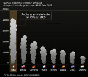 I dati sono in miglioramento, ma sempre gravissimi. Secondo l’ultimo rapporto dell’Agenzia Europea per l’Ambiente, negli ultimi diciannove anni l’impatto dei tre principali inquinanti – polveri sottili, biossido di azoto e ozono – si è ridotto in modo significativo. In particolare, tra il 2005 e il 2023 i decessi legati alle PM2.5 sono diminuiti del 57% nell’Unione Europea.