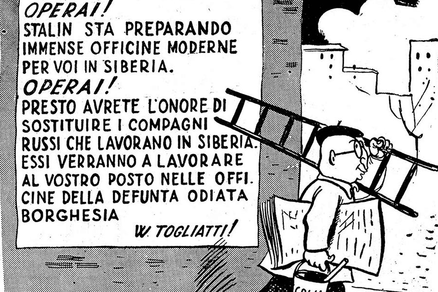 La mostra “La Costituzione a Colori” è un omaggio alla nostra Carta fondamentale, a settant’anni dalla sua promulgazione. L’esposizione è articolata in due sezioni. Nella prima parte vediamo una serie di disegni satirici e umoristici estrapolati dai giornali pubblicati in Italia tra il 1943 e il 1948 che illustrano il difficile cammino che portò alla promulgazione della Costituzione. Scorrendo le tavole ci troviamo davanti a grandi artisti come Giovannino Guareschi (di cui ricorrono quest’anno i 50 anni dalla morte) che sulle pagine di Candido fu portavoce dell’anticomunismo ed altri, come il gruppo di Don Basilio, che sostenevano invece le ragioni del comunismo. Tra le vignette d’epoca più curiose spiccano quelle disegnate da Federico Fellini con una striscia di Giacomino e la testa di Giuseppe Garibaldi che, capovolta, diventa il volto di Stalin.