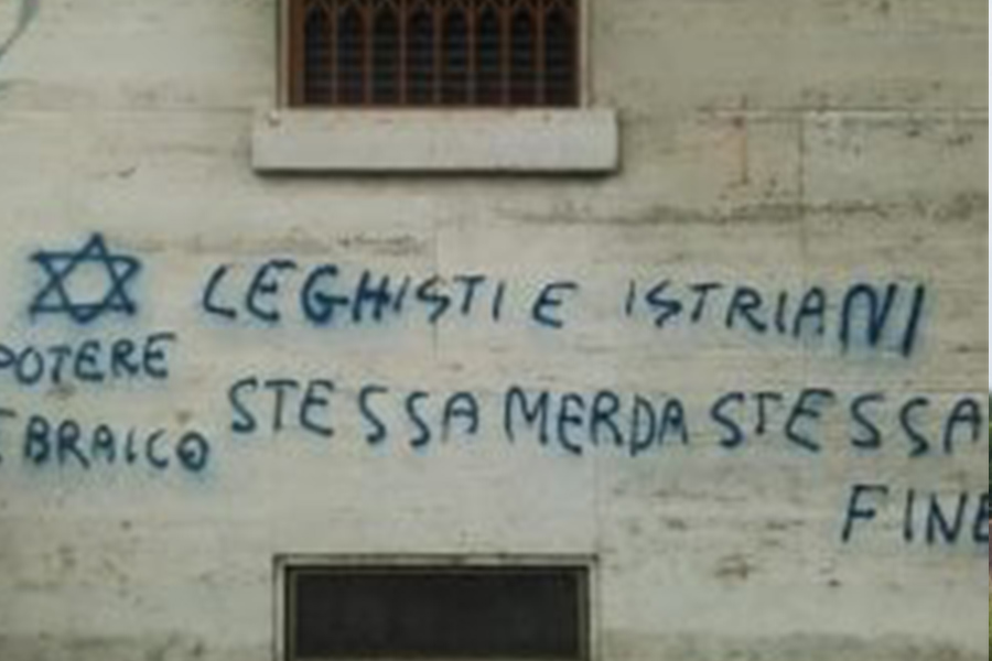 Scritte deliranti e pesantemente offensive sono apparse sui muri di una palazzina in zona San Paolo, a Torino.”Leghisti e istriani. Stessa m… e stessa fine”, firmato Potere Ebraico.