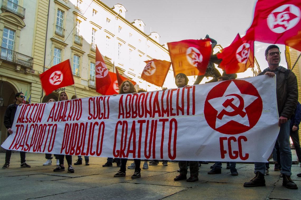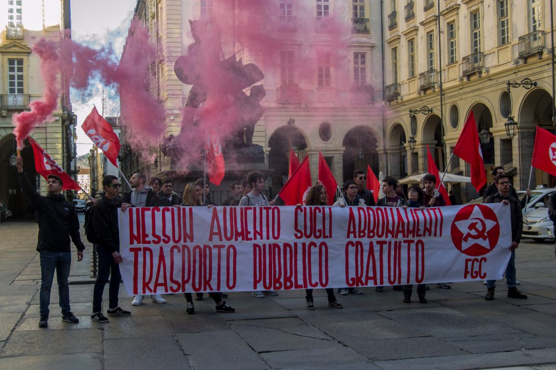 Dopo la presentazione ufficiale delle nuove tariffe degli abbonamenti del trasporto pubblico urbano della Gtt le proteste non hanno tardato a farsi sentire. Nel tardo pomeriggio davanti al Palazzo di Città i militanti del Fronte della Gioventù Comunista hanno organizzato un presidio di protesta.