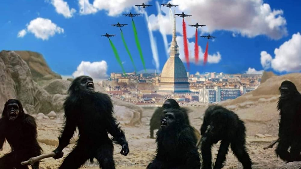 Su Instagram, il Banksy della Mole ha raffigurato le Frecce che dipingono il tricolore in cielo, osservate dagli scimmioni protagonisti nelle scene iniziali del film di Stanley Kubrick “2001 Odissea nello spazio”.