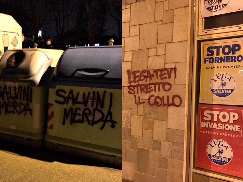 Due scritte sono comparse la scorsa notte sui muri della sede della Lega a Collegno, in provincia di Torino.