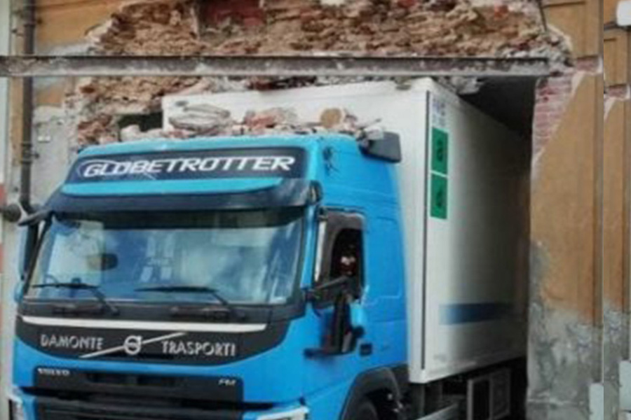Si stava spostando all’interno di un passaggio che porta al cortile del supermercato Basko, ma qualcosa è andato storto. Nel corso della manovra è anche franato un pezzo di muro addosso al camion.
