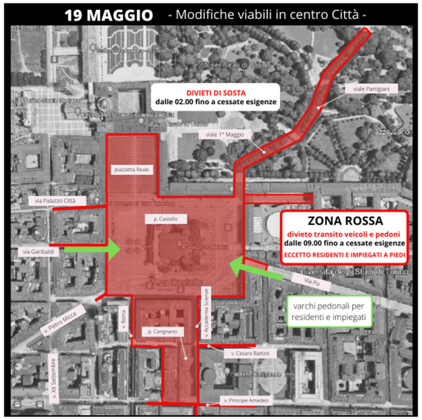Dalle ore 9 e fino a cessate esigenze saranno chiuse al traffico veicolare e pedonale l’area di piazza Castello e piazzetta Reale; l’area di piazza Carignano e via Accademia delle Scienze; via Roma, nel tratto compreso tra via Cesare Battisti e piazza Castello; via Principe Amedeo, nel tratto tra le vie Bogino e Roma; via Cesare Battisti, nel tratto tra piazza Carlo Alberto e via Roma; viale 1° Maggio, nel tratto tra piazza Castello e i fornici dei Giardini Reali; via Palazzo di Città, tra via XX Settembre e piazza Castello; via Garibaldì, tra via XX Settembre e piazza Castello,