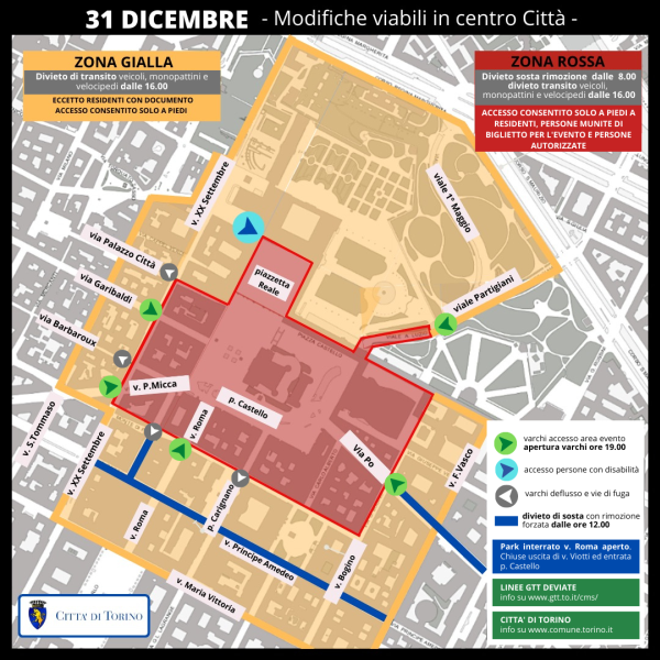 Dalle ore 19.00 del 31 dicembre all’interno della zona rossa potranno circolare a piedi esclusivamente le persone in possesso del biglietto di accesso con codice QR rilasciato al momento della registrazione sul sito della Città di Torino, i residenti e le persone autorizzate.