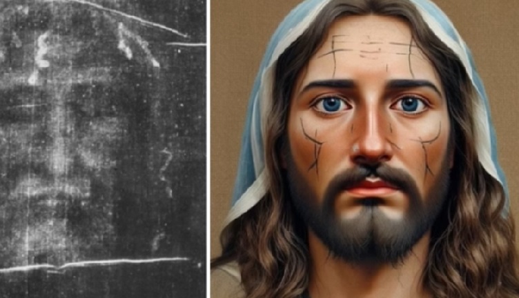 L’Intelligenza artificiale ha generato l’immagine di un uomo con barba, capelli scuri, occhi azzurri e cicatrici sul volto, simili a quelle visibili sulla Sindone.