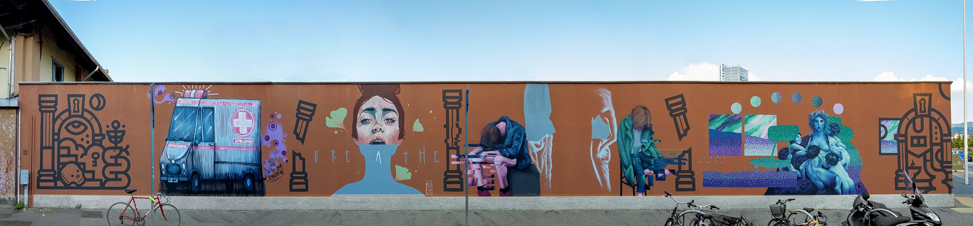 Sulla parete di C.so Ferrucci Mr. Fijodor, Nice and the Fox, Droufla e i Wasp, tra i portali della Salute e della Casa. hanno rappresentato le conseguenze del Lockdown legate agli aspetti sanitari e psicologici.