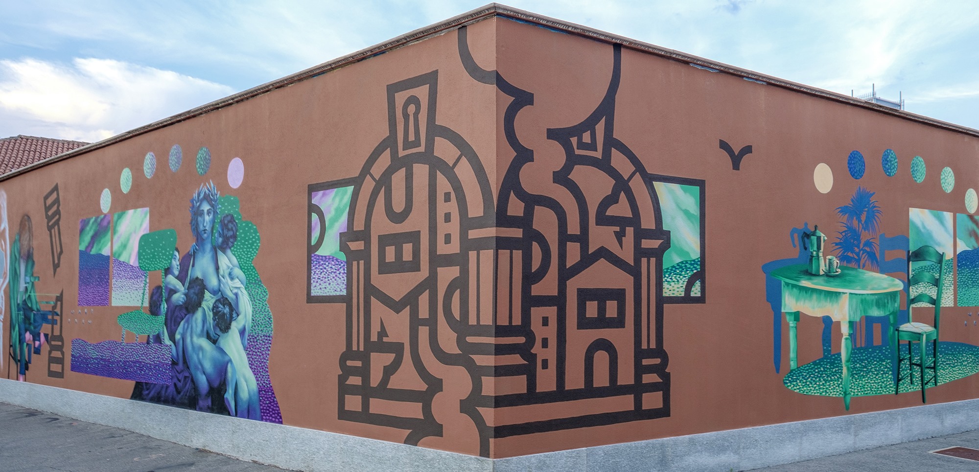 Le opere prodotte dagli artisti sono inquadrate in 3 rappresentazioni di elementi architettonici, realizzati da Abel Bael, posti a inizio, a metà e a fine della parete. Questi sono le chiavi di volta per poter uniformemente interpretare lo svolgimento dell’intero intervento.