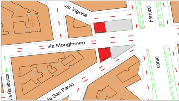 In via Monginevro le due carreggiate di collegamento con le vie San Paolo e Vigone diventeranno pedonali: si tratta di due brevi tratti privi di passi carrai.