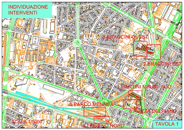 – parcheggio Braccini Ovest, dove sarà rimossa la pavimentazione esistente, ripristinata la permeabilità, raccolta l’acqua meteorica, realizzati nuovi spazi verdi urbani e inserite barriere ombreggianti;