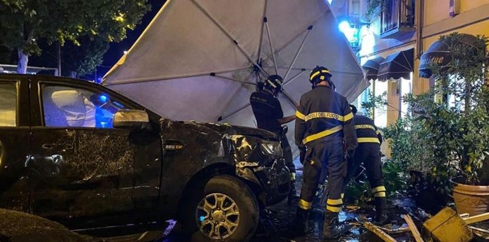 Un uomo alla guida di un Renault Traffic ha improvvisamente perso il controllo del mezzo ed è finito sul dèhors del ristorante, investendo una donna che si trovava sul posto.