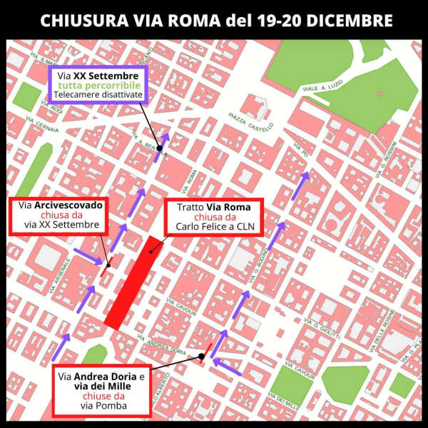 Il Comune di Torino informa che nelle giornate di sabato 19 e domenica 20 dicembre, dalle ore 10 alle 20, sarà chiuso al traffico veicolare il tratto di via Roma compreso tra Piazza Carlo Felice e Piazza CLN. Inoltre, saranno chiuse via Arcivescovado in direzione ovest all’angolo con via XX Settembre, via Andrea Doria e via dei Mille in direzione est all’angolo con via Pomba.
