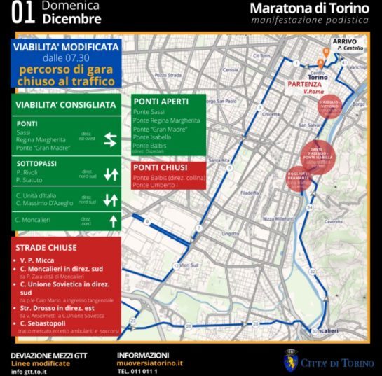 La partenza, fissata per le ore 8.30,è posizionata in via Roma angolo via Bertola, mentre l’arrivo sull’area pedonale di piazza Castello. La durata prevista della manifestazione è di circa 5 ore e mezza e il percorso sarà chiuso a partire dalle ore 7.50 gradatamente di pari passo con il passaggio della corsa fino alle 15.00 circa. Anche le riaperture saranno graduali e avverranno man mano che l’ultimo concorrente sarà transitato.