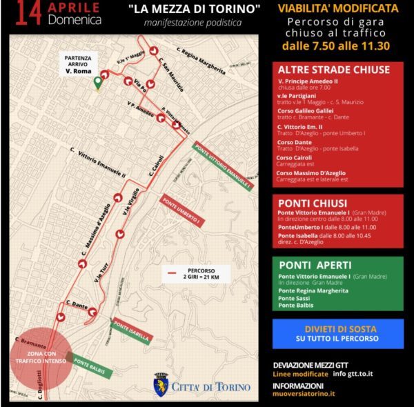 Domenica 14 Aprile in città si svolgerà la manifestazione sportiva denominata ‘La Mezza Di Torino’, gara podistica di tipo competitivo sulla distanza di 21 km all’interno della quale si svolge anche la gara sulla distanza di 10 km denominata ‘La Dieci di Torino’.