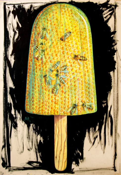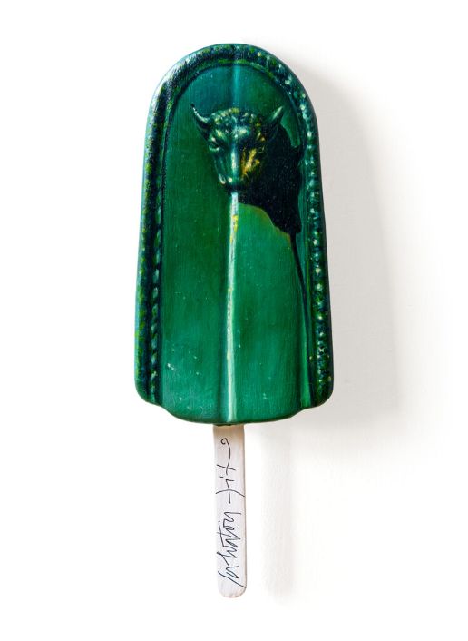 Del gelato da passeggio, solo lo stecco di legno rimane nudo, il resto è un “ricoperto” di metaforico significato. Così un oggetto ludico, infantile si riveste di verde acido, di aculei, di spine, di chiodi e api. Affiora una dimensione ibrida in cui l’originale morbidezza convive e si contrappone con una suggestione pungente.