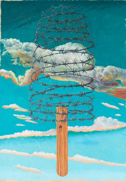 Cieli azzurri, luminosi, parlano di libertà e di spazi aperti, inarrivabili però per chi li guarda, che resta dietro a un filo spinato. Si assapora l’ebbrezza attraverso la breccia delineata dalla forma dello stick, ma non ci si può immergere, né raggiungerla. Oppure è il cielo stesso a essere rinchiuso, trattenuto da uno stick spinato che imprigiona i cirri, costretti vicini, ammassati ma pronti a esplodere per sganciarsi da un momento all’altro.