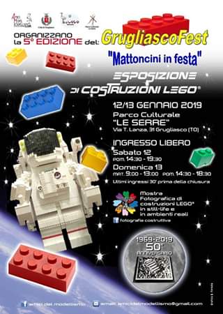L associazione Amici del modellismo organizza per il weekend del 12-13 Gennaio 2019 la mostra di costruzioni in LEGO® “Grugliascofest mattoncini in festa” che si terrà a Grugliasco nel parco culturale Le Serre in via Tiziano Lanza 31 con ingresso gratuito.