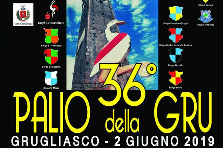 Domenica 2 giugno ritorna a Grugliasco il Palio della Gru, giunto alla trentaseiesima edizione. L’organizzazione è a cura dell’associazione “Cojtà Gruliascheisa”, ideatrice e organizzatrice dell’evento dal 1984. Il momento clou del Palio è la corsa dei carri, durante la quale le sette borgate di Grugliasco si contendono l’ambito drappo e i prodotti dell’abbondanza contadina: vino, formaggi e pane.